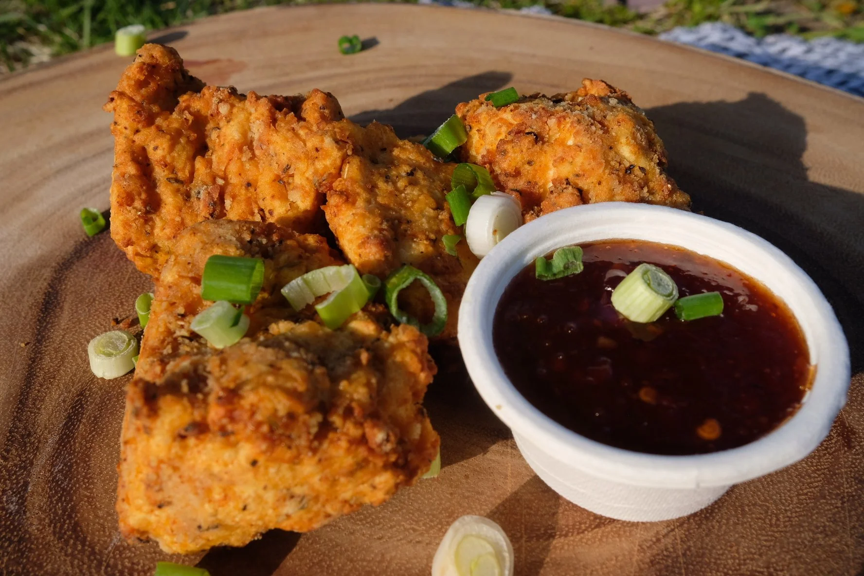 Hand-breaded crunchy vegan fried Chick-UN nuggets served with sweet chili dipping sauce (Gluten Free).