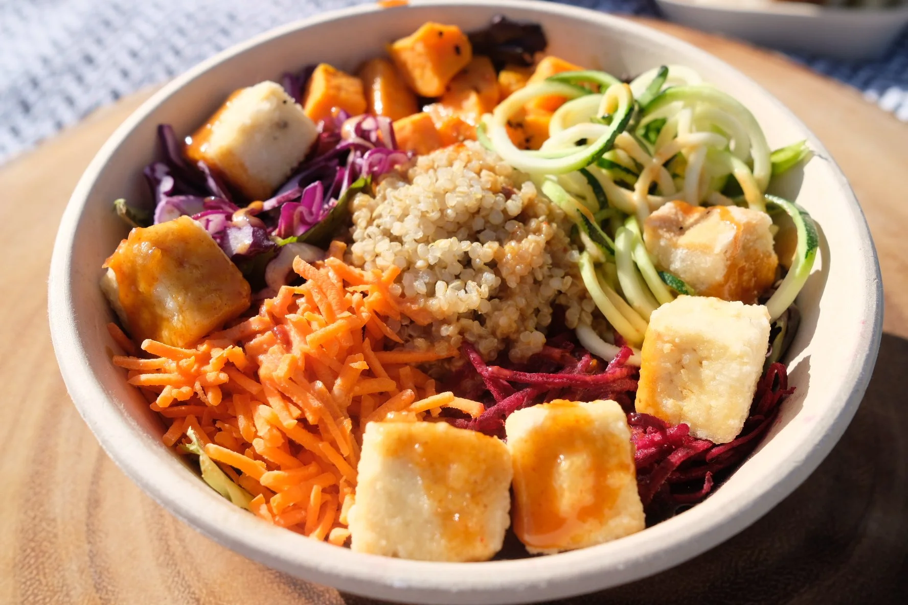 This hearty bowl is filled with a tasty combination of mixed greens, quinoa, beets, carrots, roasted sweet potatoes, zucchini and crispy tofu topped with our delicious homemade peanut sauce.