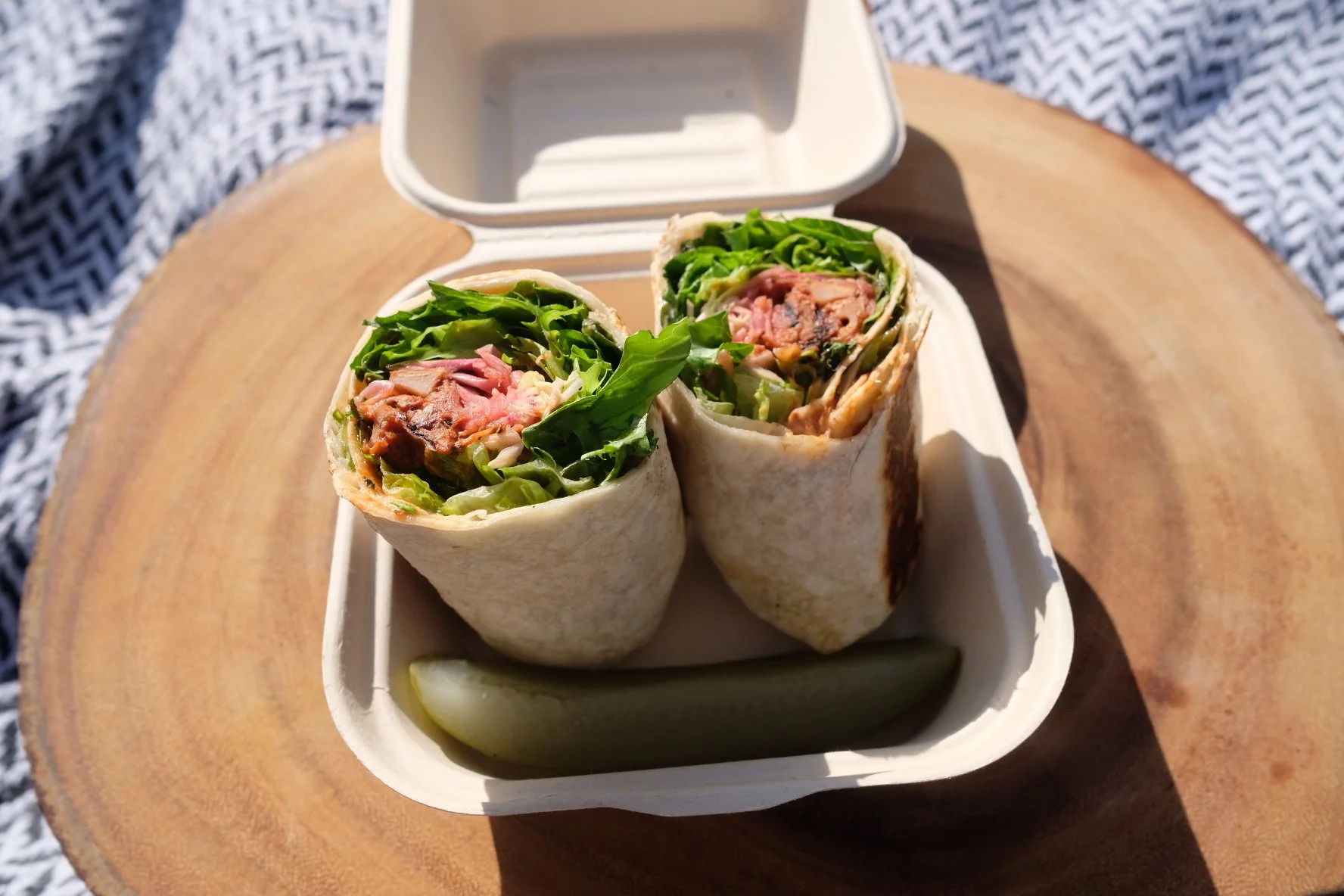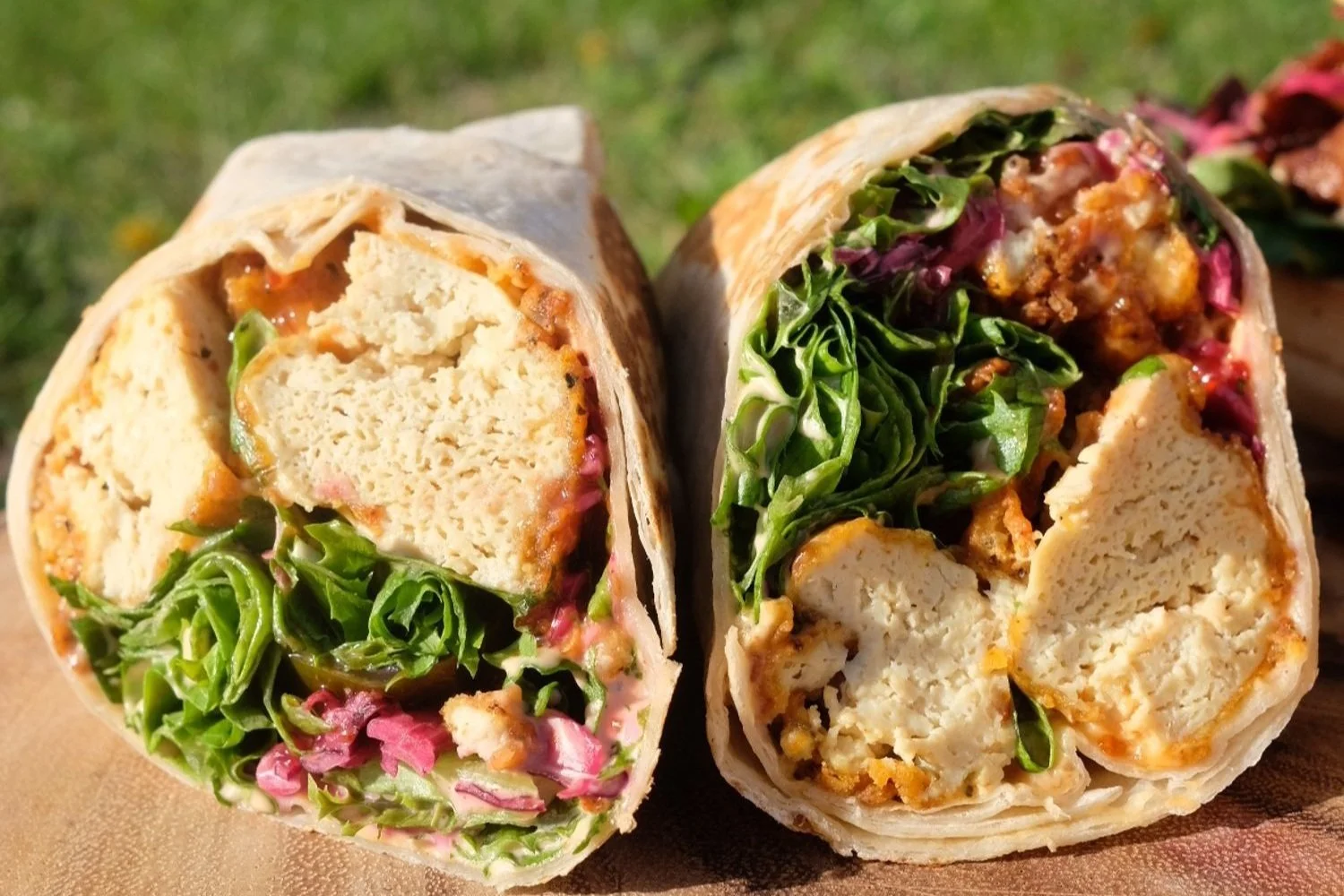 Our hand breaded crunchy vegan fried mayo, chili sauce, jalapeno peppers and cabbage slaw all wrapped in a flour tortilla, served with a dill pickle.