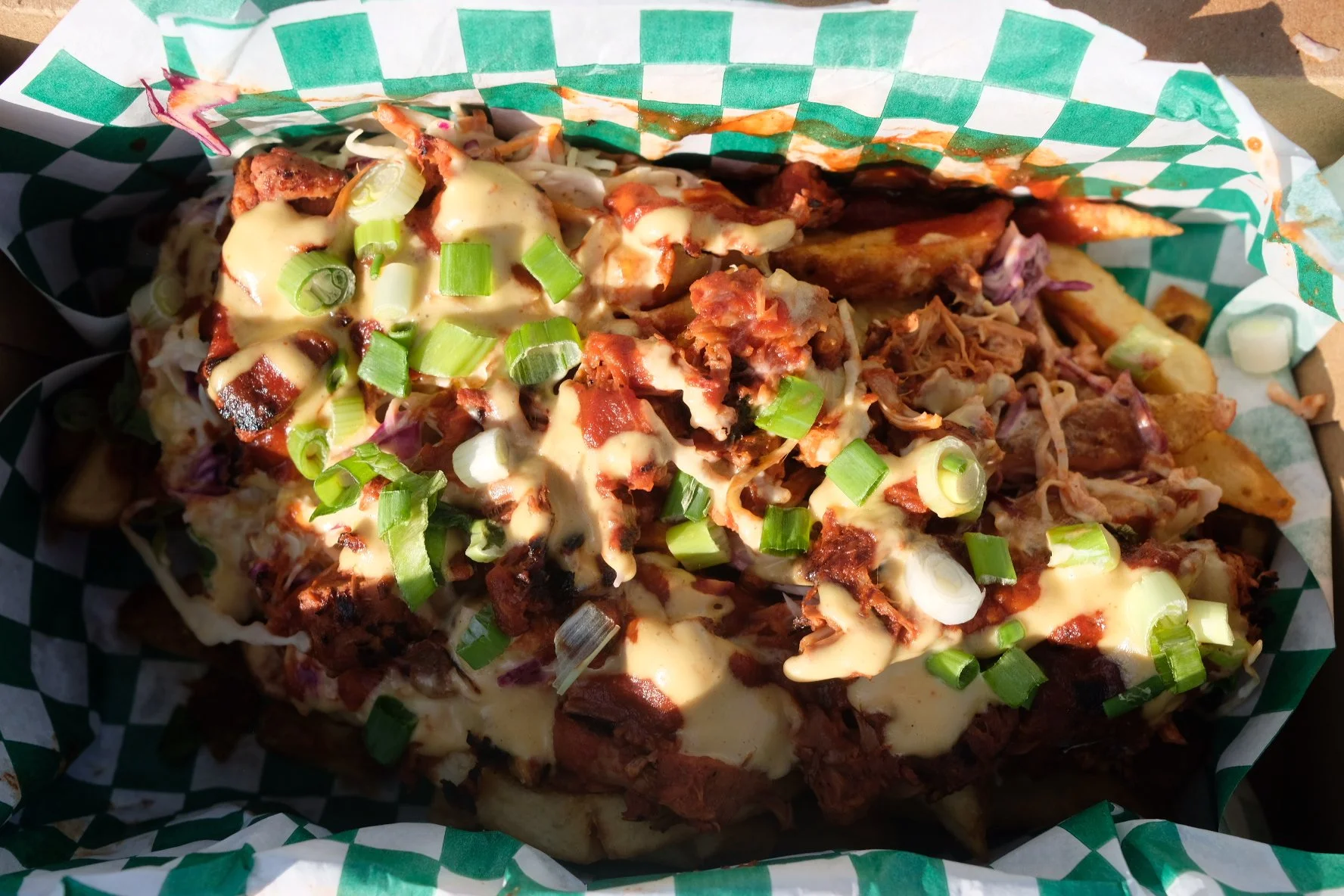 Fresh skin-on fries loaded with sweet and smokey jackfruit, slaw, BBQ sauce and garlic aioli (Gluten Free).